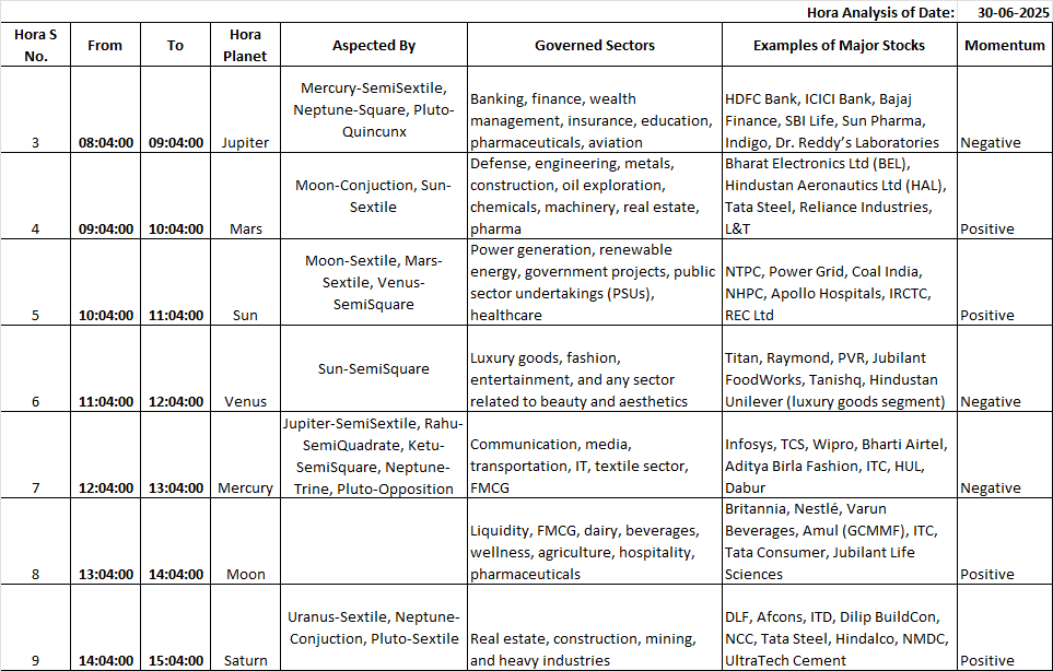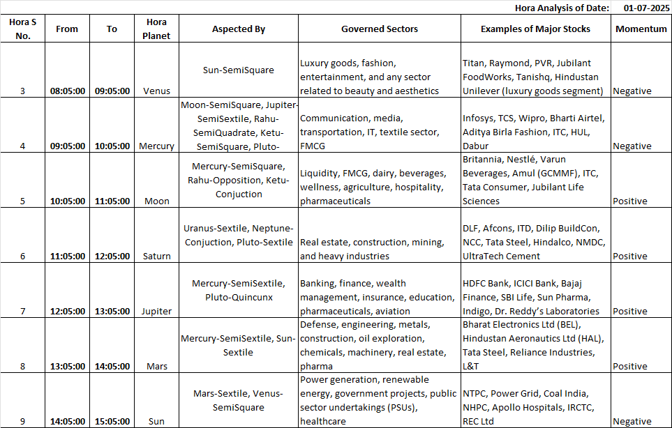 “Stay focused on Mars-governed sectors like defense, infra, and metals. Gold weakens mid-week, and silver remains volatile. Watch reversal signs post-lunch sessions on 3rd and 4th July.“